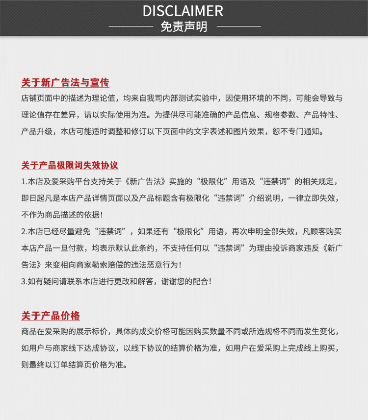 本站支持关于《新广告法》实施的“极限化”用语及“违禁词”的相关规定,即日起凡是本站所有页面特别是产品详情页面以及产品标题含有极限化“违禁词”介绍说明,一律立即失效,不作为本站所有页面及商品描述的依据!